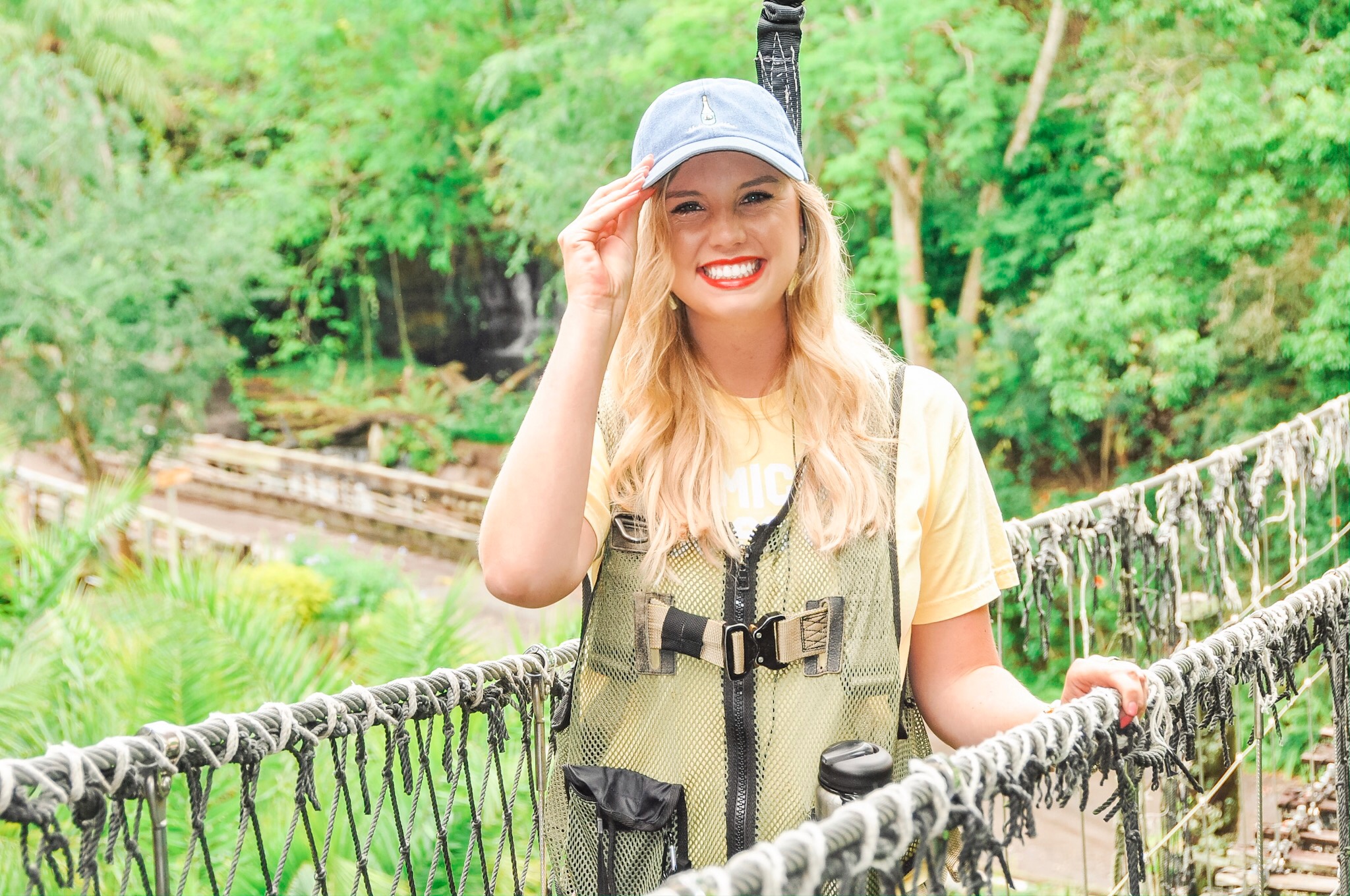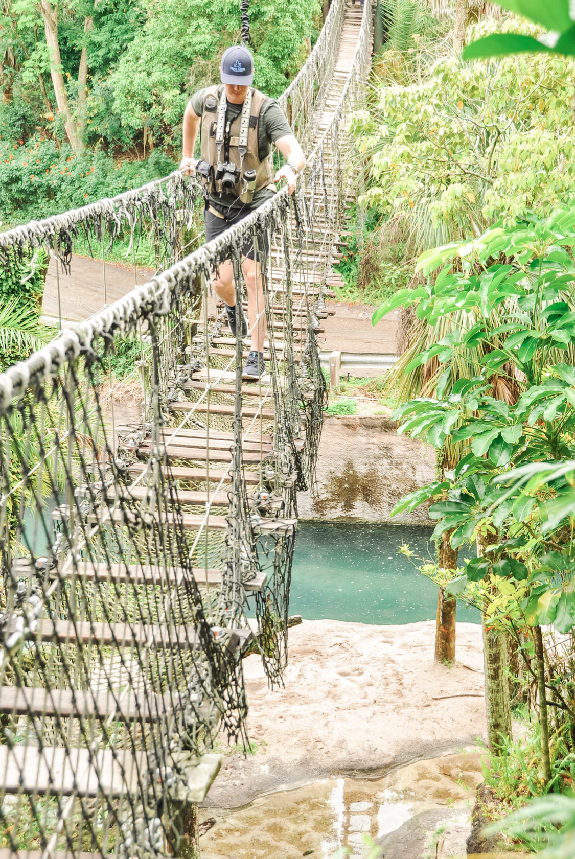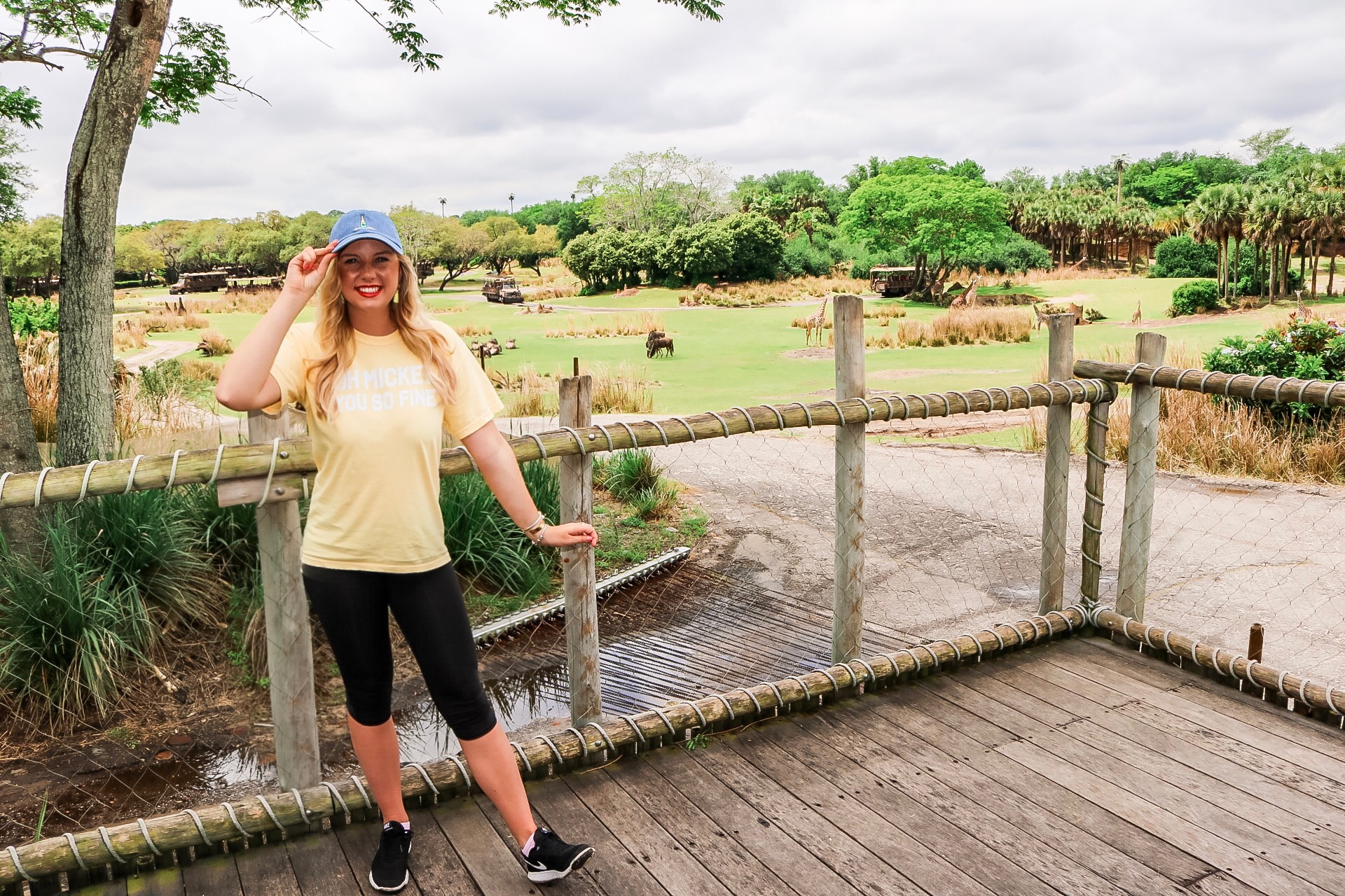 The Wild Africa Trek is a 3 hour tour at Animal Kingdom that includes trekking on a bridge above the Crocodiles, feeding the Hippos, eating on the Savanna and getting a private Safari Tour. The tour can only be scheduled by calling (407)939-8687. There are multiple times per day typically including: 8 AM, 8:45 AM, 9:30 AM, 10:15 AM, 11:45 AM, 12:30 PM, 1:15 PM, and 2:30 PM. A portion of the tour price is donated to Disney’s Conservation Fund and, at the end of the tour, you get to choose which project your portion gets donated to, either the Giraffes (hooved animals), Lions (Cats), Elephants, Rhinos or Disney’s General Conservation Fund. This is a hiking trek so be sure you and your family can hike for at least one and a half hours through the backstage areas of the Savanna! We met our tour guides Mandi and Amanda at the Kilimanjaro Safari entrance. Then were fitted for our gear which we wore the entire hiking time, given a water bottle to keep and a cute name tag! We were then taken through the Gorilla Falls Exploration Trail to the entrance of the trek. We saw and fed Hippos inside the exhibit, walked over Crocodiles, went into their exhibit and learned facts about them, got on the private safari, ate some yummy food from Tusker House that is exclusive to the tour (Chicken Curry Salad and Salmon Roulade), then finished our private safari.